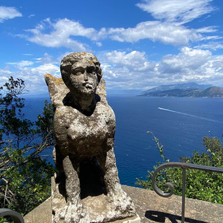 We then went on a boat tour around the island, past the blue and green grottos, seeing the statues on Solaro, and the Gennario di Scugnizzo, a little statue dude on a rock waving at the passing tourists. The Faraglioni are impressive and odd rock structures dramatically positions off the shore, but we not only got to boat through them, we kayaked them a few days later (stay tuned). When away from our small group, we went to the Alex Munthe house, another eccentric german doctor type with great taste in flowers. There is a real 'sphinx' on the property and the legend is, if you touch the sphinx, you will definitely return to Capri. But don't sit on it...there's 1000 signs to that effect.